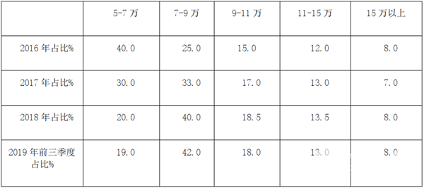 根据ABD车市统计数据,近年及2019年前三季度农村小客运市场价格区段比重统计: