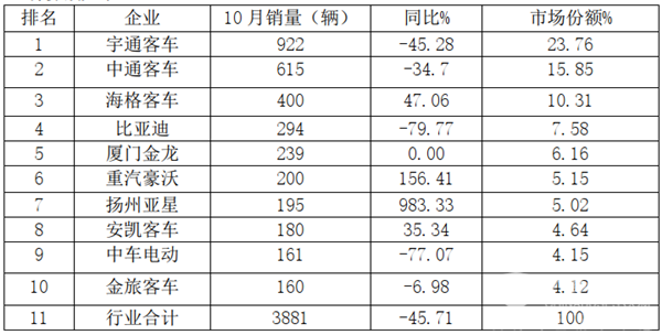 根据行统计数据,2019年10月前10名客车企业新能源客车销量、同比及市场份额如下: