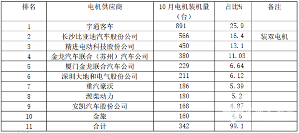 3、10月新能源客车前10名电机装机量,宇通占据的份额超四分之一成,为25.9%,可谓独占鳌头;前10名累计占据99%的份额,垄断程度明显高于新能源乘用车和专用车,这也是新能源客车不同于新能源汽车和新能源专用车的一个明显特点。