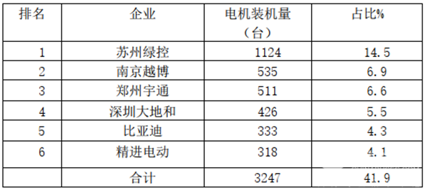 (三)新能源专用车前6名电机装机量,苏州绿控占据的份额最高,为14.5%;前6名累计占据41.9%的份额,垄断程度较低,竞争较为分散