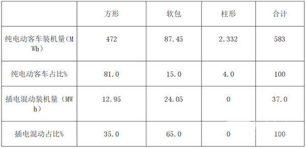 2)插电式混动客车中,软包型电池装机量最大,占比达到65.0%,其次是方形,柱形为零。