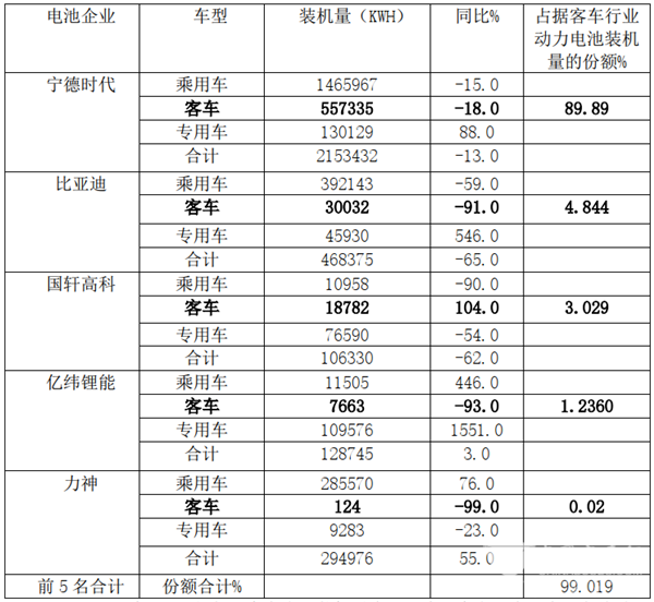 特点四、宁德时代一家独大,占比近9成;前5名企业占比99.019%,几乎垄断了整个客车行业