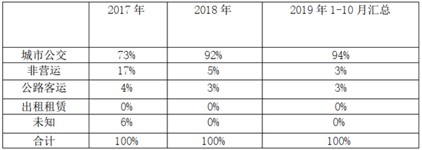 根据中国汽车流通协会市场研究统计数据,2019年1-10月及近2年新能源客车按用途划分销量比重结构如下: