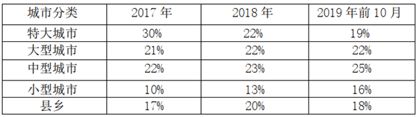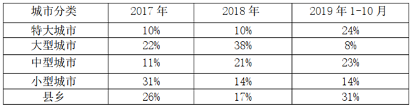 根据上牌信息统计,2019年前10月及近2年同期新能源大中客车流向各类城市比重统计:%