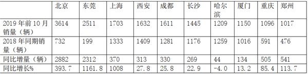 根据上牌数据统计,2019年1-10月新能源客车流向表现较好的前10个城市销量及同比: