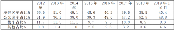 可见,从2012年起,5米以上客车市场中,座位客车占据的市场份额一直处于逐年下降状态,但到了2019年1-10月,其降幅有所收窄,反而比2018年占比高了4.9个百分点,这一特征明显。为何?