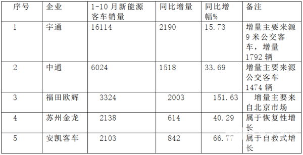 2019年前10月,上表5家龙头企业新能源客车销量同比增幅都较大,而2019年1-10月,行业累计销售6米以上新能源客车52317辆,同比下降8.5%,可见,对宇通、中通、福田欧辉、苏州金龙及安凯客车是前10月对客车行业新能源客车贡献最大的5大“功臣”。