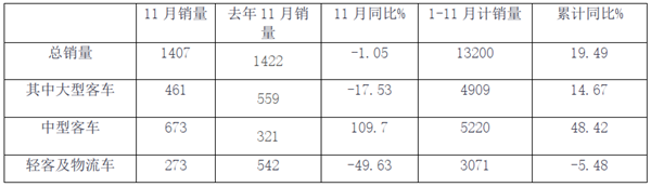 1、11月销量同比下降1.05%,应该说是基本平稳,微弱下降;主要是在新能源客车补贴过渡期结束,在整个客车市场大环境低迷的情况下,能有此表现,已相当不错。