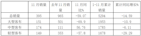 1、作为老牌子豪华客车上市公司,2019年11月销量395辆,同比下降50.07%,表现不理想;1-11月累计销售5294辆,同比下降14.59%,总体看,11月及前11月销量表现均不理想。
