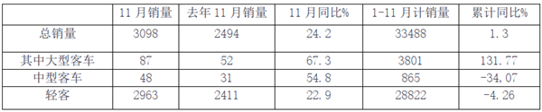 根据福田汽车12月5日发布的产销快报,其11月及1-11月客车销量如下(不含非完整车辆):