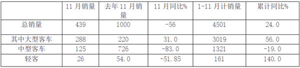 根据2019年12月4日金龙汽车集团发布的快报,2019年11月及1-11月金龙客车销量如下: