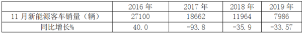根据行业统计数据显示,2019年11月新能源客车销量同比、环比统计表,表1