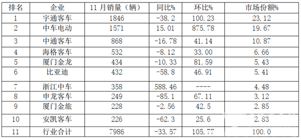 1.11月宇通客车依然稳居冠军宝座,依然称雄行业。11月销售新能源客车1846辆,同比下降38.2%,环比大增1倍多,月度销量占行业23.12%的份额。