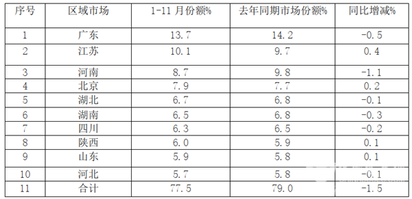 1、2019年1-11月广东、江苏、河南是销量最多的前三甲,广东最多,占据市场份额为13.7%,但同比降低0.5%,这也说明广东的电动化程度在逐渐趋于饱和,尽管份额最大,但在萎缩了。