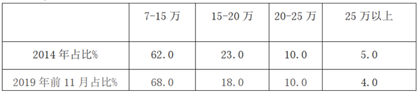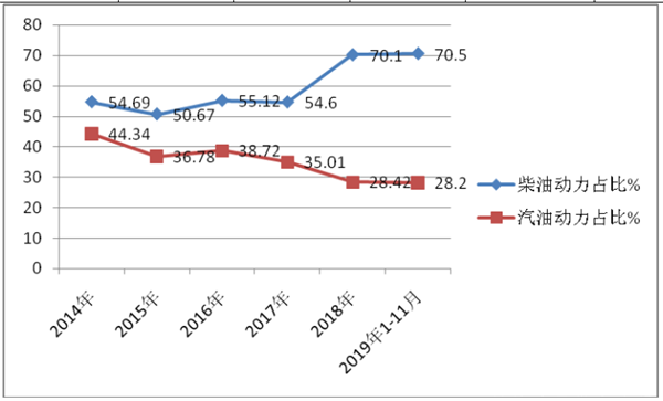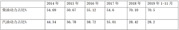 可见,在燃料方面,2019年柴油动力车型占比激增至70.5%,而汽油动力车型却下降到28.2%,可以说是柴油当道。