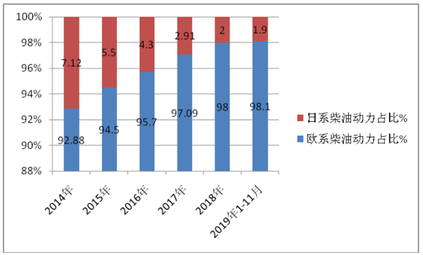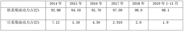 根据数据统计,近6年柴油动力欧系与日系比重占比: