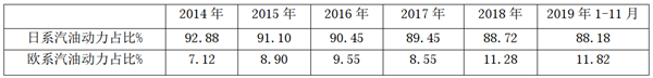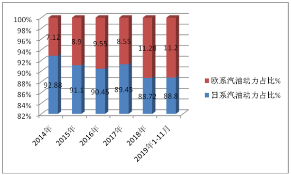 根据数据统计,近6年汽油动力欧系与日系比重占比: