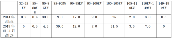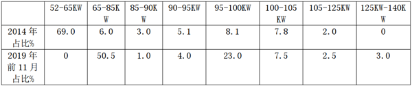 可见在日系车型中,功率范围由2014年的52-125KW提升至2019年的65-140KW,范围整体向上平移。其中80KW以下及95-100KW车型销量变化较明显,更大的功率销量更好些