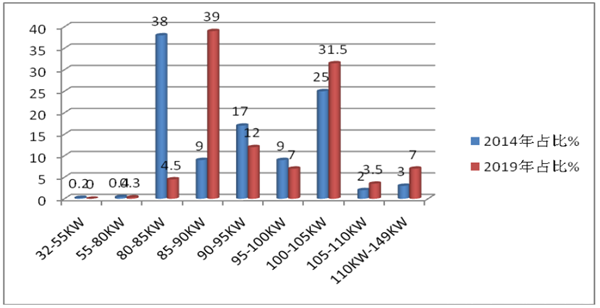 特征三、欧系减围,日系升段-----欧系车型功率范围由2014年的32-192KW的160KW功率差值减小到2019年的55-149KW的94KW功率差值,功率范围缩小