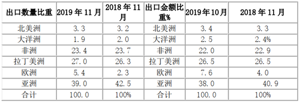 根据海关销售流向区域统计数据整理,2019年11月中国客车出口流向全球各大洲的销量占比、金额占比及与2018年同期比较情况表