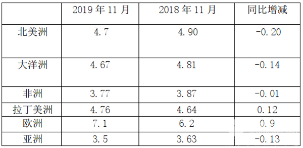 特点三、欧洲单价最高,同比均价增幅幅最大;亚洲单价最低---2019年11月中国客车产品出口到各大洲均价(万美元)解析