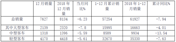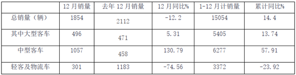 1、12月销量同比下降12.2%,主要是轻型及物流车同比下降导致。但大中型客车同比均为正增长。