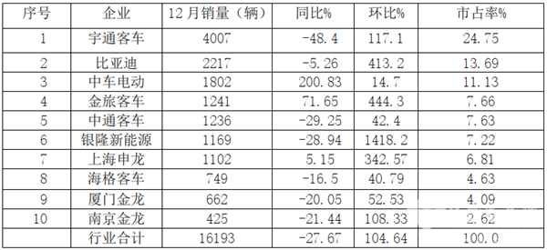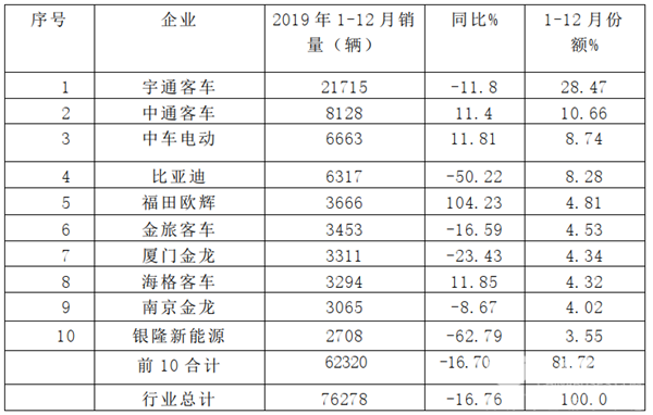 2019年12月及全年新能源客车市场盘点