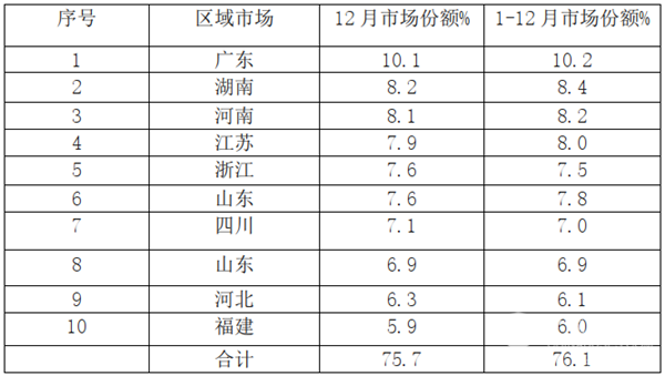 12月及2019年1-12月广东、湖南、河南等前10名区域市场份额 均超过75%,区域市场垄断程度可见一斑。