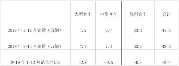 根据中汽协数据,2019年12月,客车销售6.3万辆,环比增长29.8%,同比下降2.5%;2019年全年累计销售客车47.4万辆,同比下降2.3%;现对2019年全年大中轻客车具体销量特征进行简单盘点。