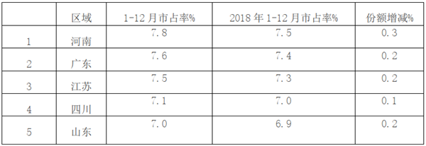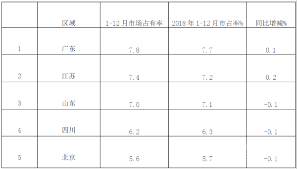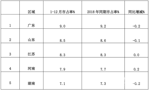 根据各地上牌数据统计,2019年1-12月大中轻客车市场占有率前5名区域市场如下: