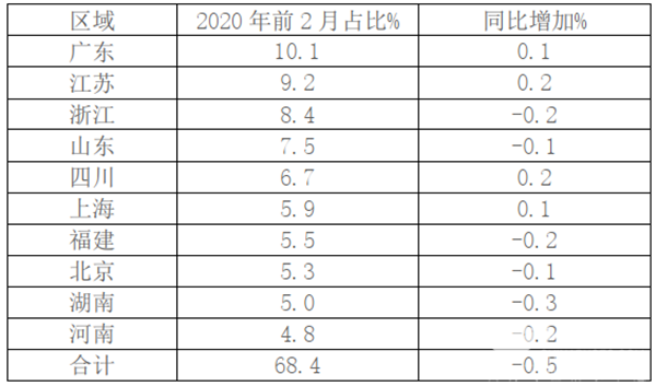 1、2020年前2月考斯特客车在广东区域销量最大,市占率超10%,也是唯一超10%的区域;