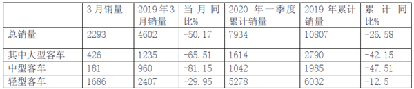 根据福田汽车2020年4月6日发布的产销快报,其2020年3月及一季度客车销量如下: