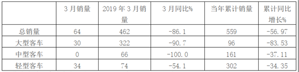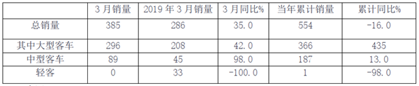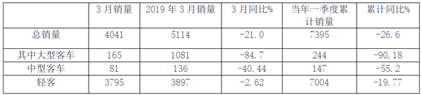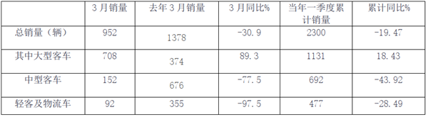 根据安凯客车2020年4月9日发布的产销公告,2020年3月及一季度销量数据如下: