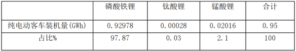 在2020年一季度新能源客车中,磷酸铁锂电池装机量占比为97.87%,处于绝对的垄断地位。主要是因为磷酸铁锂电池热稳定性好,安全性能比较高。这对载人的客车来说是至关重要的;锰酸锂电池装机总量占比为2.1%,全部拥有插电式混合动力客车,钛酸锂电池占比最小,只有0.03%,全部用于纯电动客车。