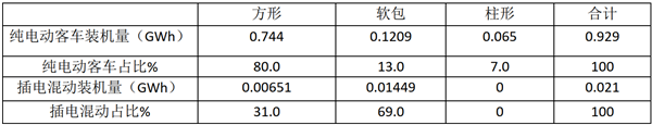 特点三、纯电动客车方形电池装机量占比8成,插电式混合动力客车中,软包型电池装机量占比近7成,为最大