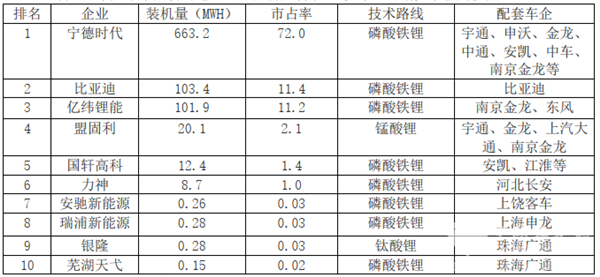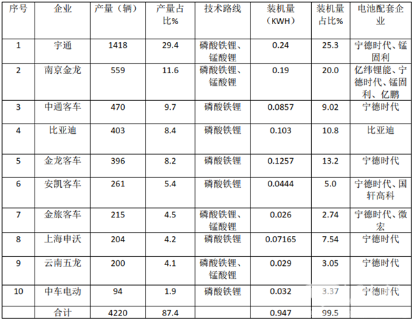根据起点研究院(SPIR)数据,2020年一季度前10名电池企业配套新能源客车企业装机量: