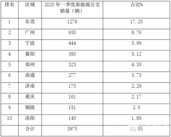 根据上牌信息统计,2020年一季度前10名城市新能源公交销量: