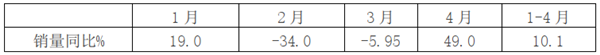 表2,根据乘联会数据,2020年1-4月各月欧系轻客销量同比: