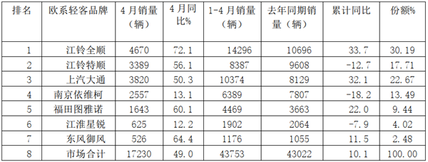 1.江铃轻客(包含福特商标的福特全顺和JMC商标的江铃特顺)仍然稳居行业第一,根据其公布的月报,其4月份销量为8059辆,同比增长65%;1-4月总销量达到2.27万辆,同比增长11.7%,市场份额达到48%。表现最抢眼的要属福特品牌轻型商用车(江铃福特全顺),其4月份销量同比逆市上升72.1%,1-4月累计销量近1.43万辆,同比逆势上涨33.7%,市场占有率达到30.19%,江铃特顺4月大涨56%,1-4月累计销售8387辆,市场份额为17.7%,总体看其实力仍然居老大。