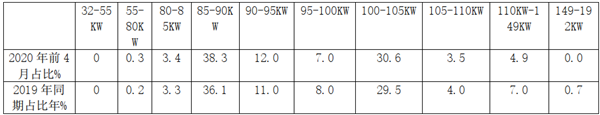 四、功率在85-90KW的车型销量占比和100-105KW的销量占比均增加,是构成2020年1-4月欧系轻客表现出色的主体部分-----1-4月欧系车型功率范围由2019年的55-192KW的137KW功率差值减小到2020年的55-149KW的94KW功率差值,功率范围缩小,但功率在85-90KW范围车型销量占比增加最多,其次增加是100-105KW范围的车型