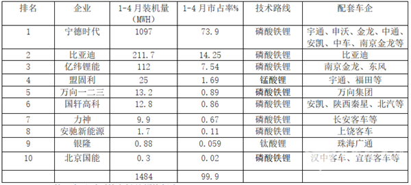 根据起点研究院(SPIR)数据,2020年1-4月前10名电池企业配套新能源客车企业装机量: