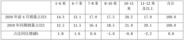 根据上牌信息,2020年前4月,按长度段划分,公路客车市场结构: