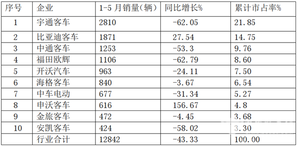 1-5月累计销量中,宇通遥遥领先,独占鳌头;比亚迪居夺得亚军,中通摘取季军,前三排名相对平稳;排名第4以后,企业你争我夺;竞争胶着;TOP10中累计同比6降4增;同比增长最大的是申沃客车,同比降幅最大的是福田欧辉