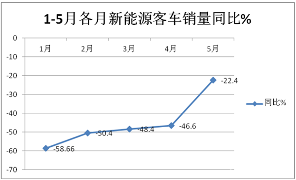 根据中国客车统计信息网数据,2020年1-5月各月新能源客车销量同比走势: