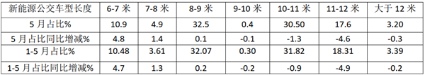 根据中国客车统计信息网数据,2020年5月及1-5月不同车长新能源客车销量份额同比变动情况: