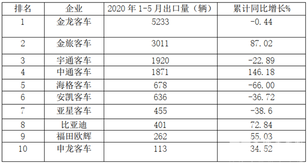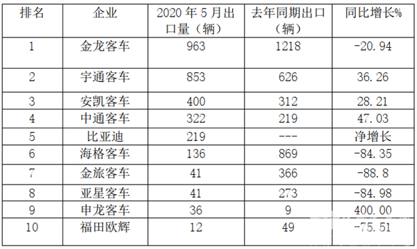 根据中国客车统计信息网统计数据,2020年5月出口TOP10企业: