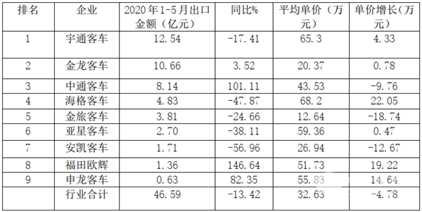 根据中国客车统计信息网数据,2020年1-5月主流客车出口金额及平均单价统计: