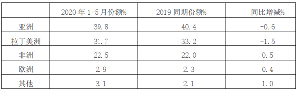 根据海关数据统计,2020年1-5月我国各类客车(含非完整车辆)出口2.03万辆。全球各大洲份额如下: