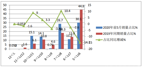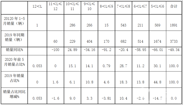 可见,在2020年前5月按长度段划分的校车占比结构中,呈现特征: