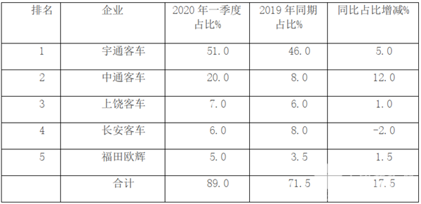 根据中国客车信息网统计数据,2020年前5月校车TOP5企业销量占比统计: